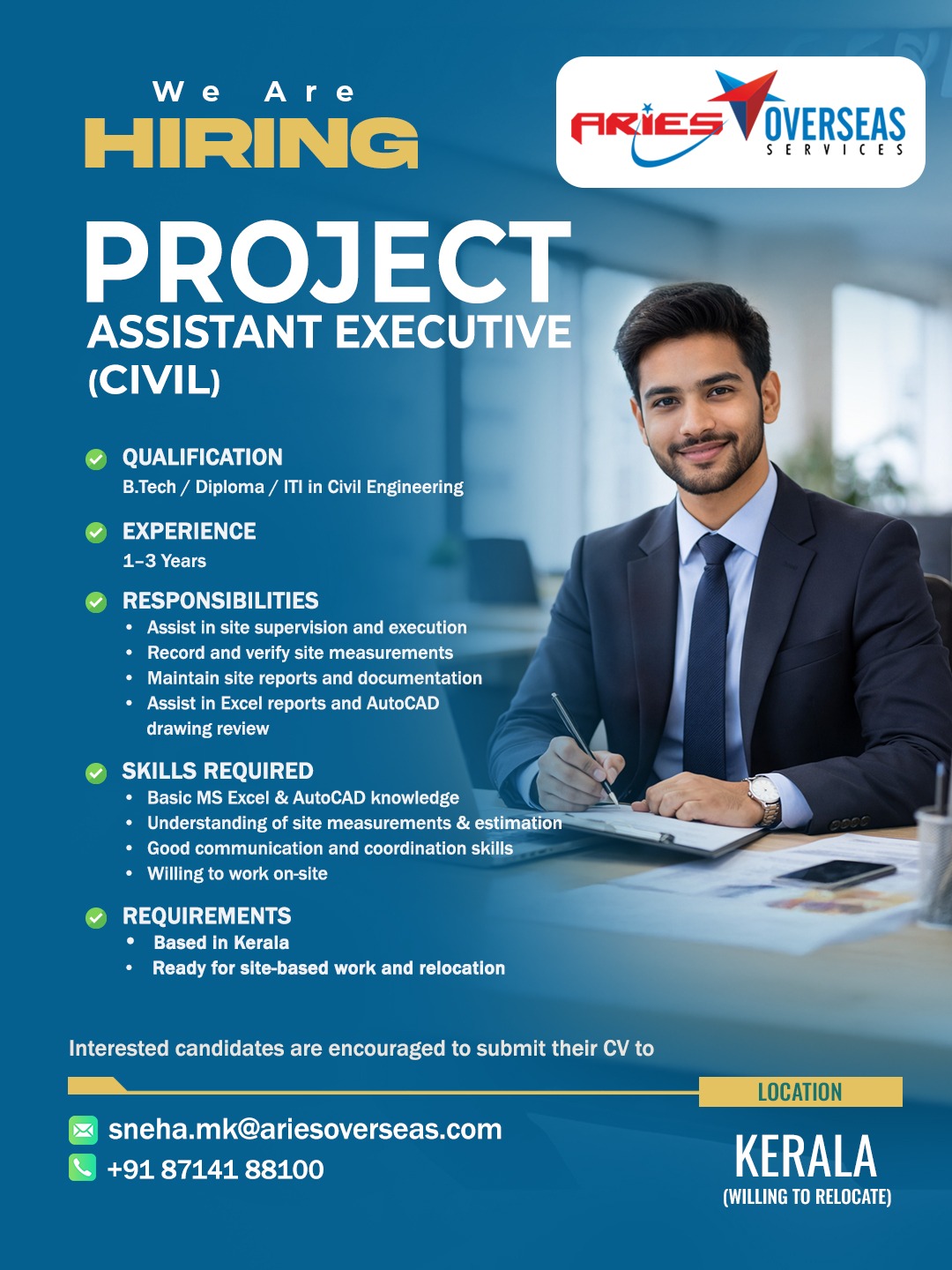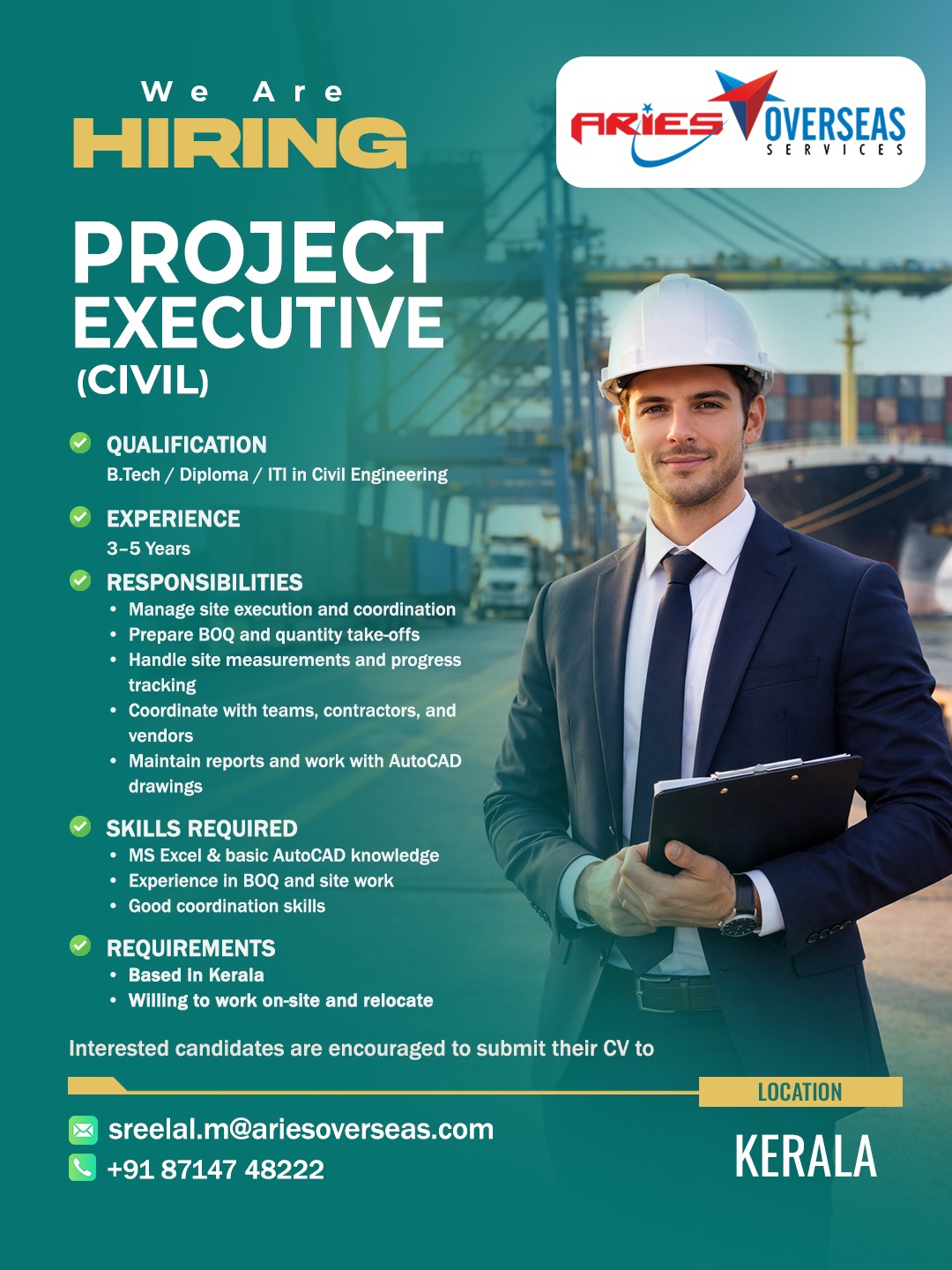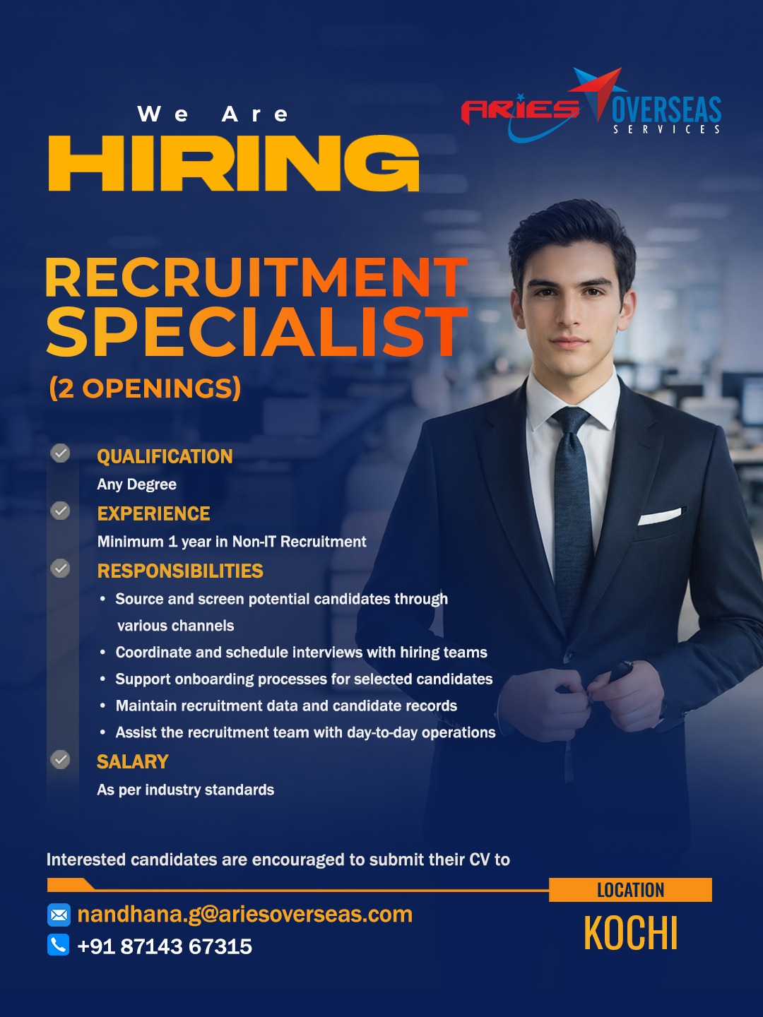 Aries Overseas Services is an International Overseas Recruitment / Human Resource Solutions Provider who actively search, recruit and screen candidates for employment. Aries Overseas Services hold a recruitment license issued by the Ministry of Overseas Indian Affairs with License No. B-0754/KER/PER/1000+/5/9121/2014.