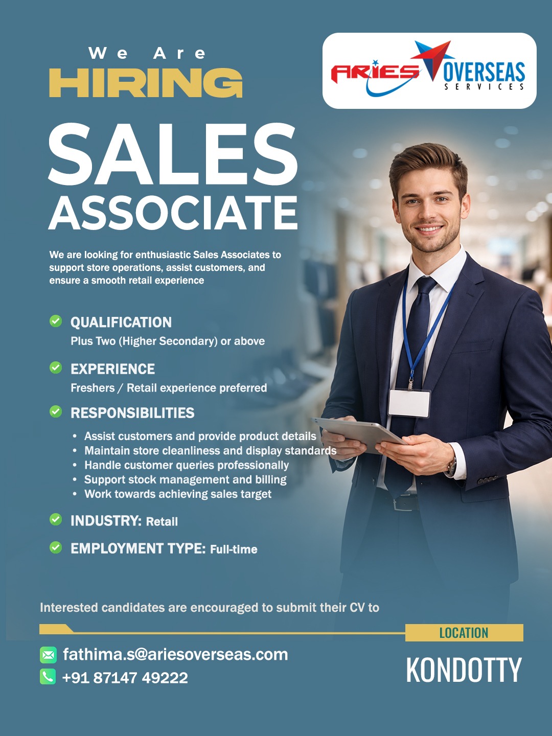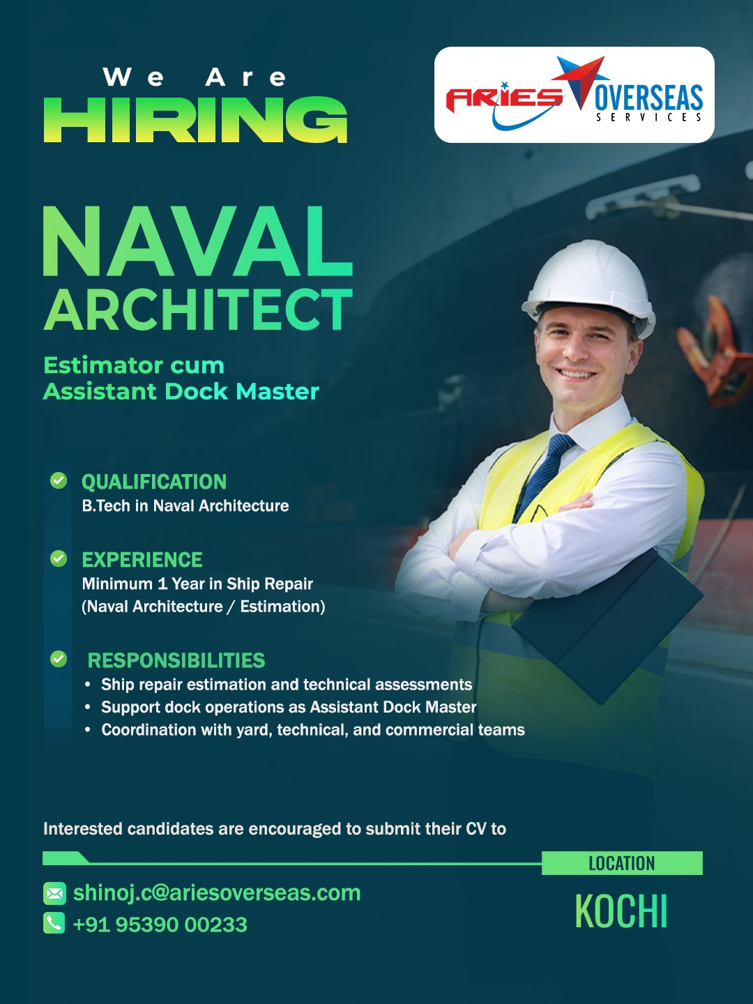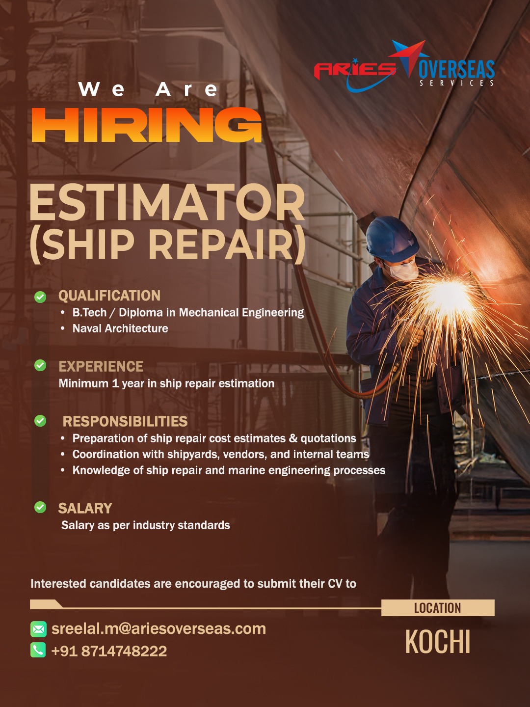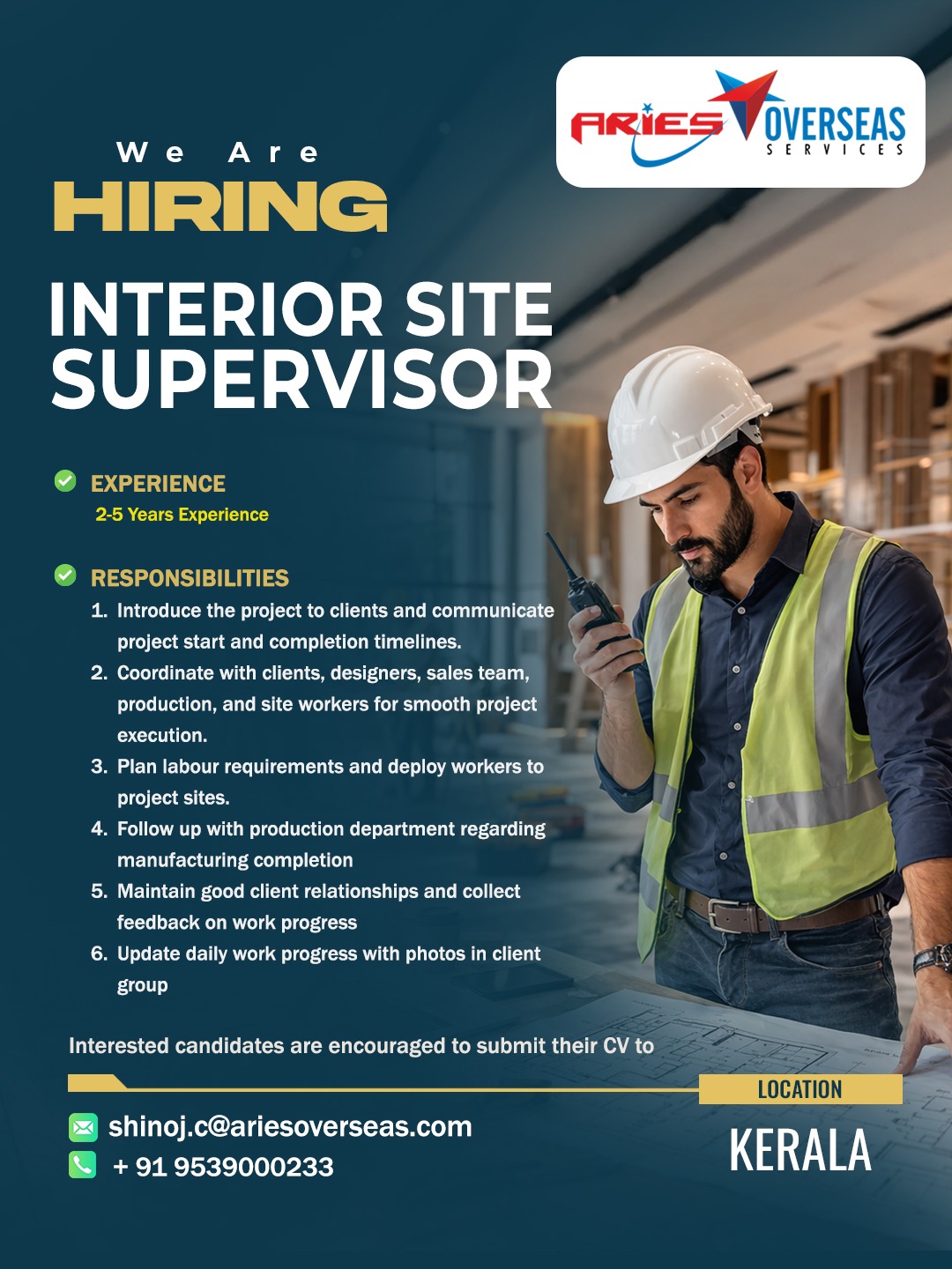 Aries Overseas Services is an International Overseas Recruitment / Human Resource Solutions Provider who actively search, recruit and screen candidates for employment. Aries Overseas Services hold a recruitment license issued by the Ministry of Overseas Indian Affairs with License No. B-0754/KER/PER/1000+/5/9121/2014.